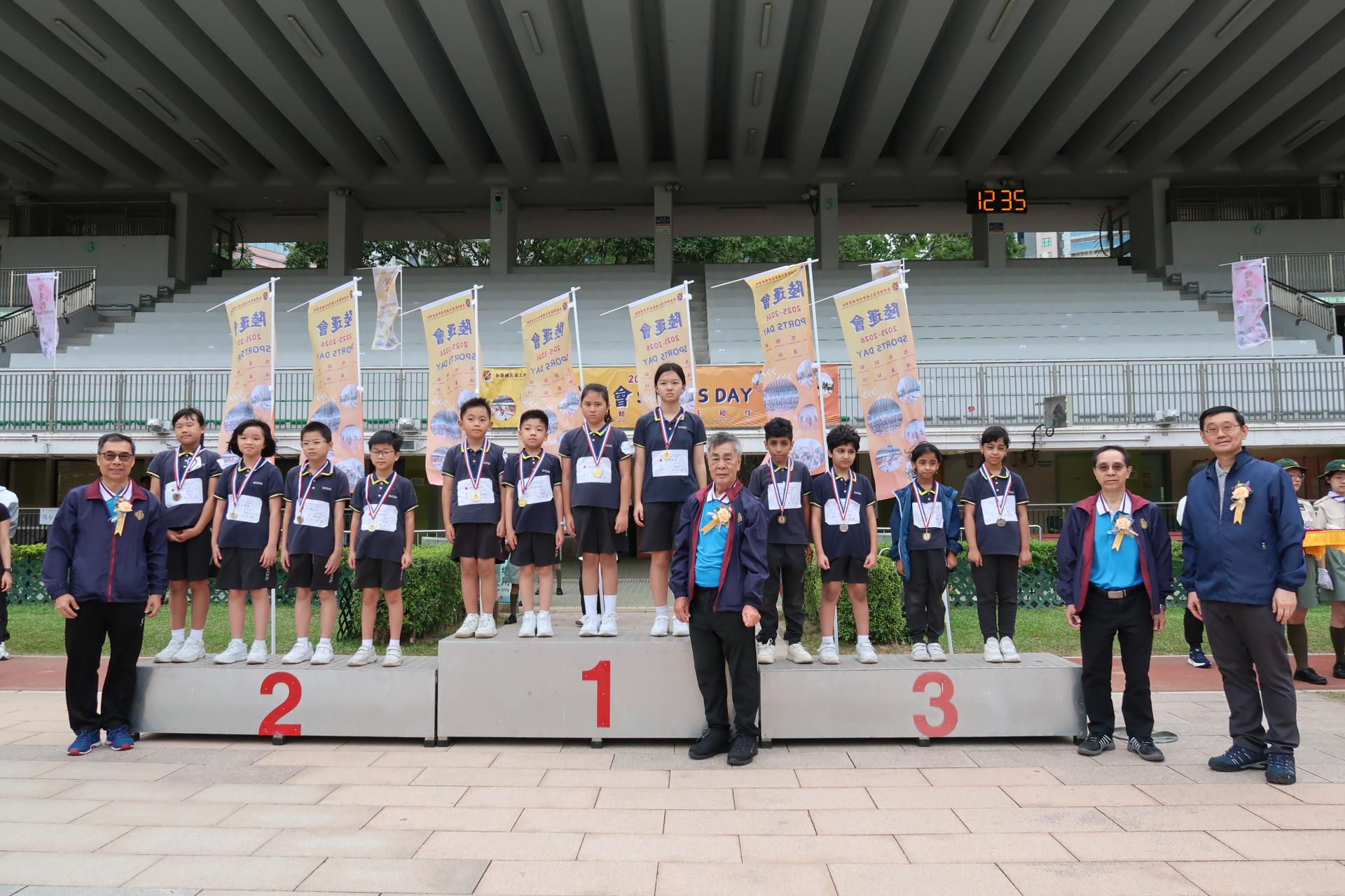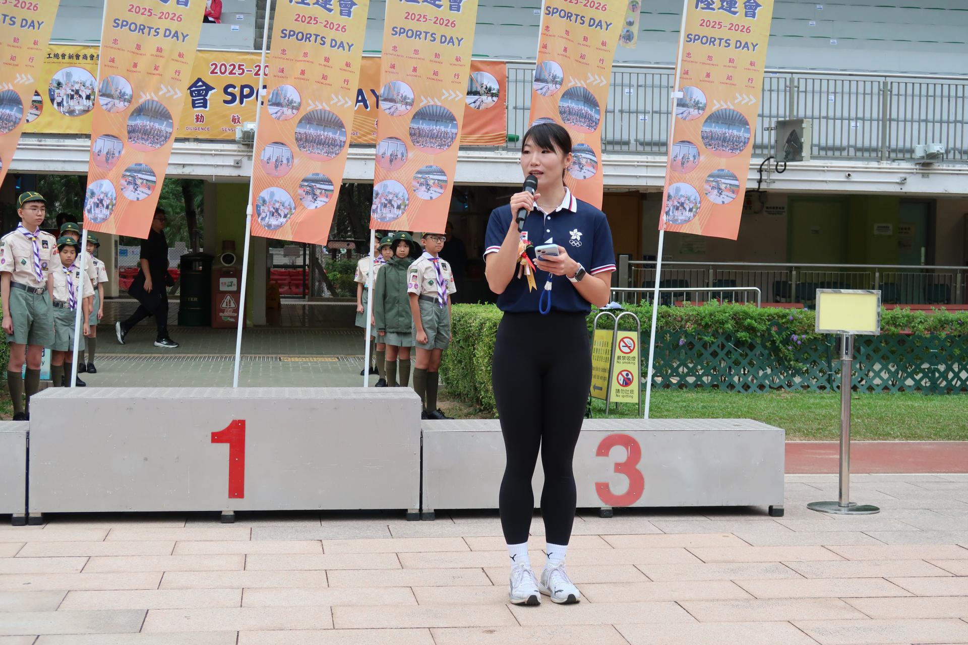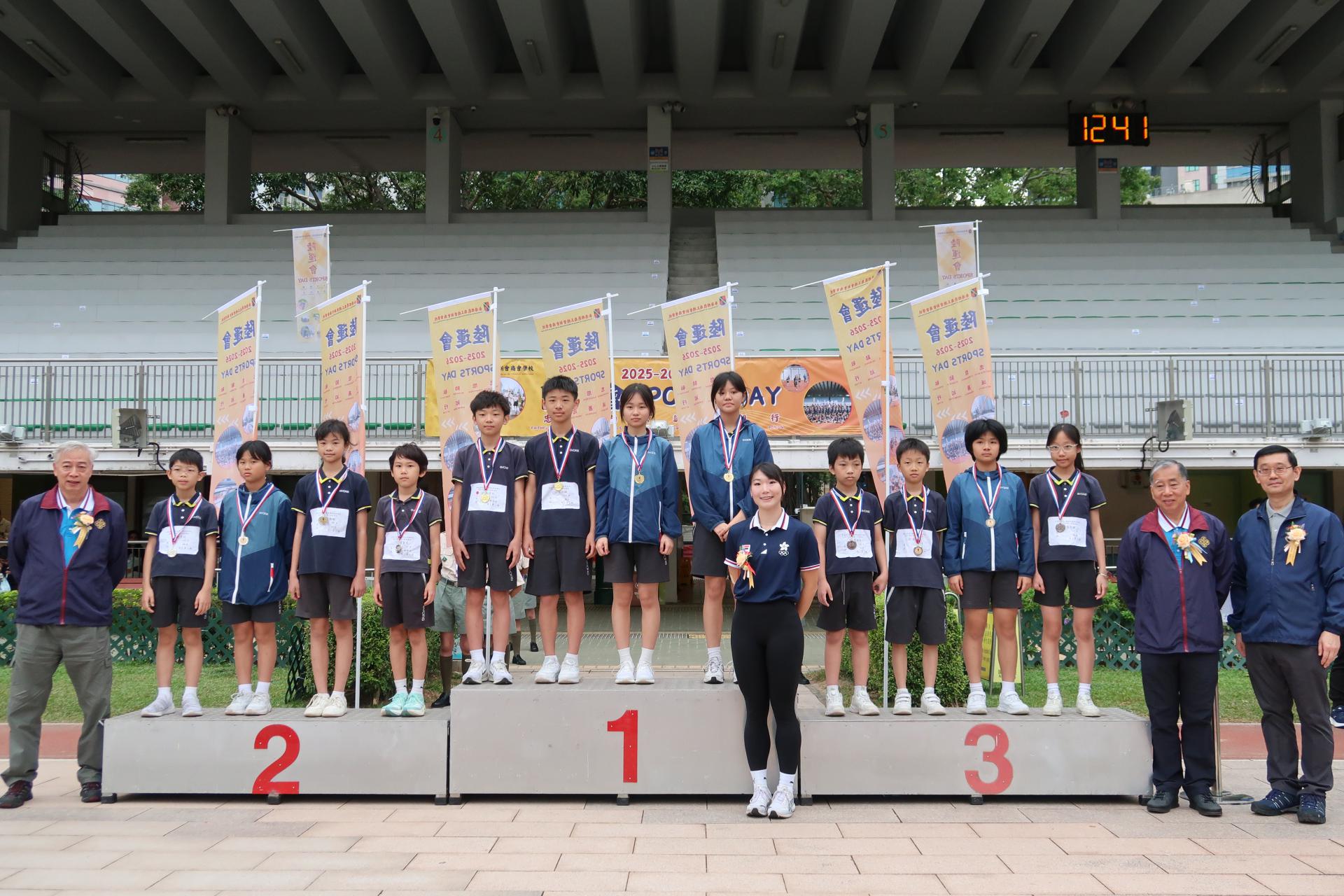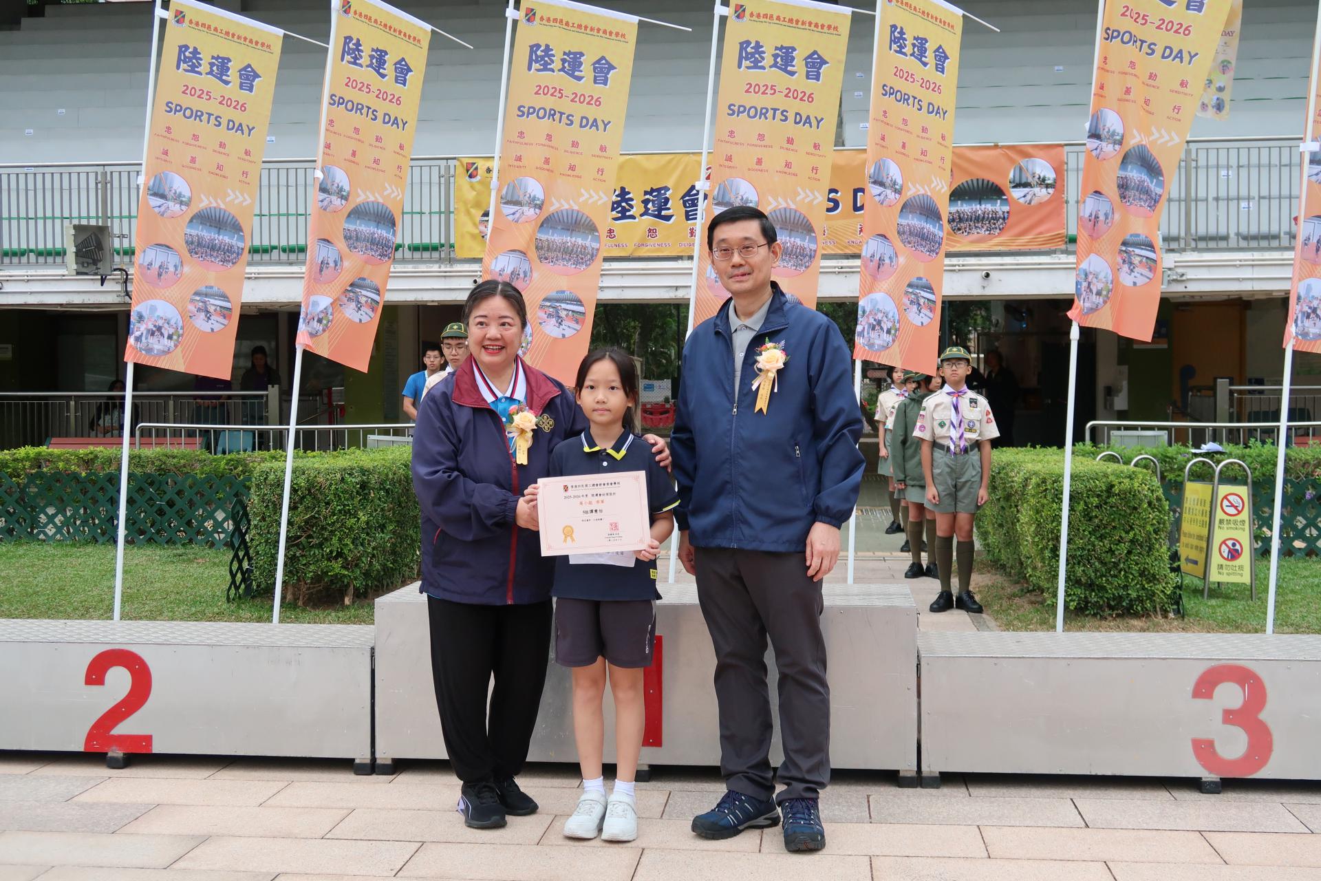 二零二五年十一月十一日本會屬校香港四邑商工總會新會商會學校假深水埗運動場舉行2025至2026年度陸運會頒獎典禮,恭請2023年杭州亞運代表/女子4×100米接力紀錄保持者/