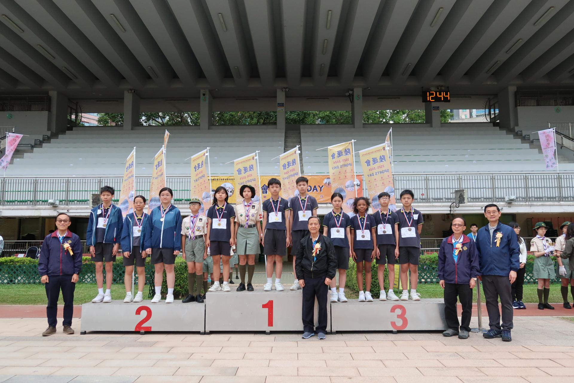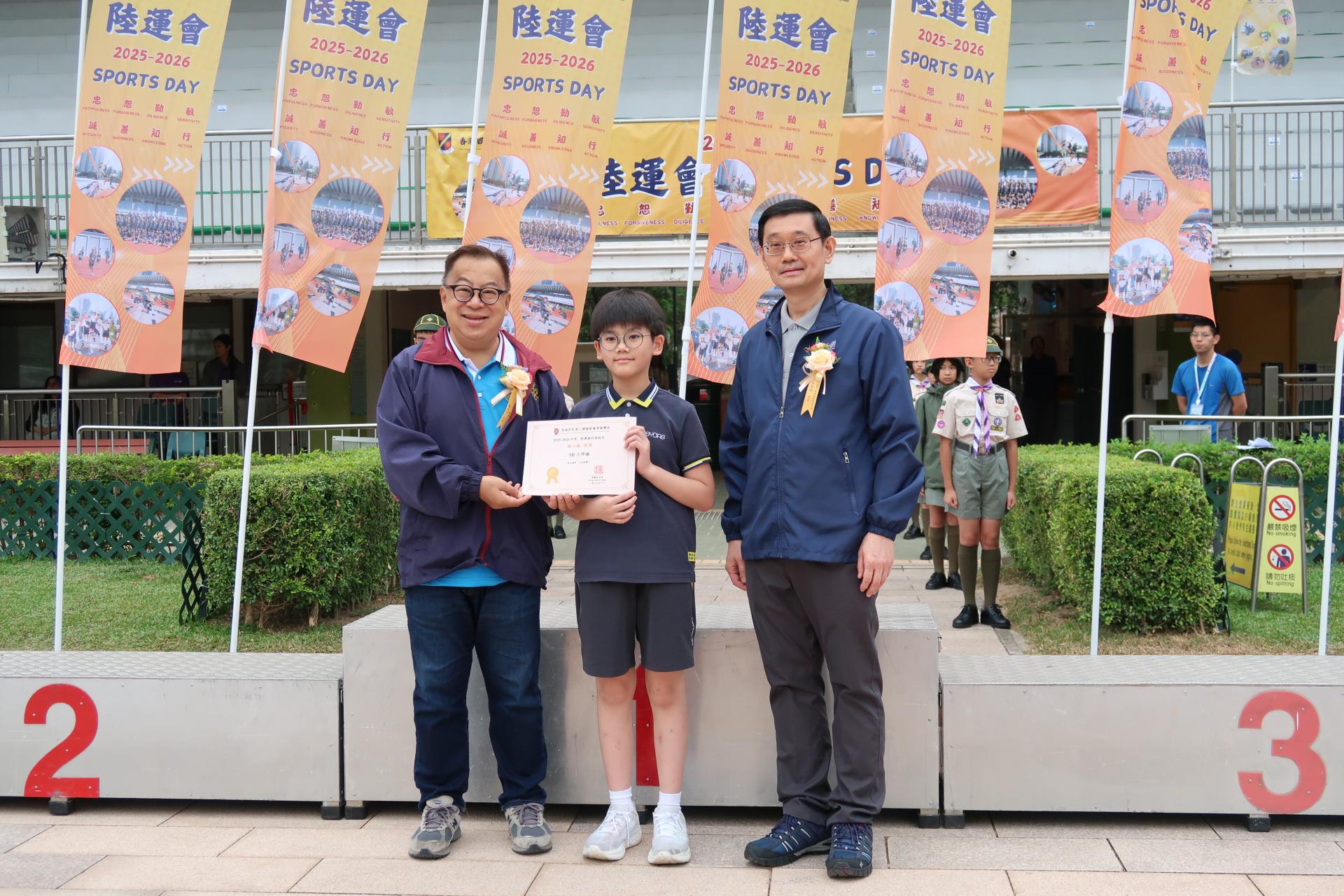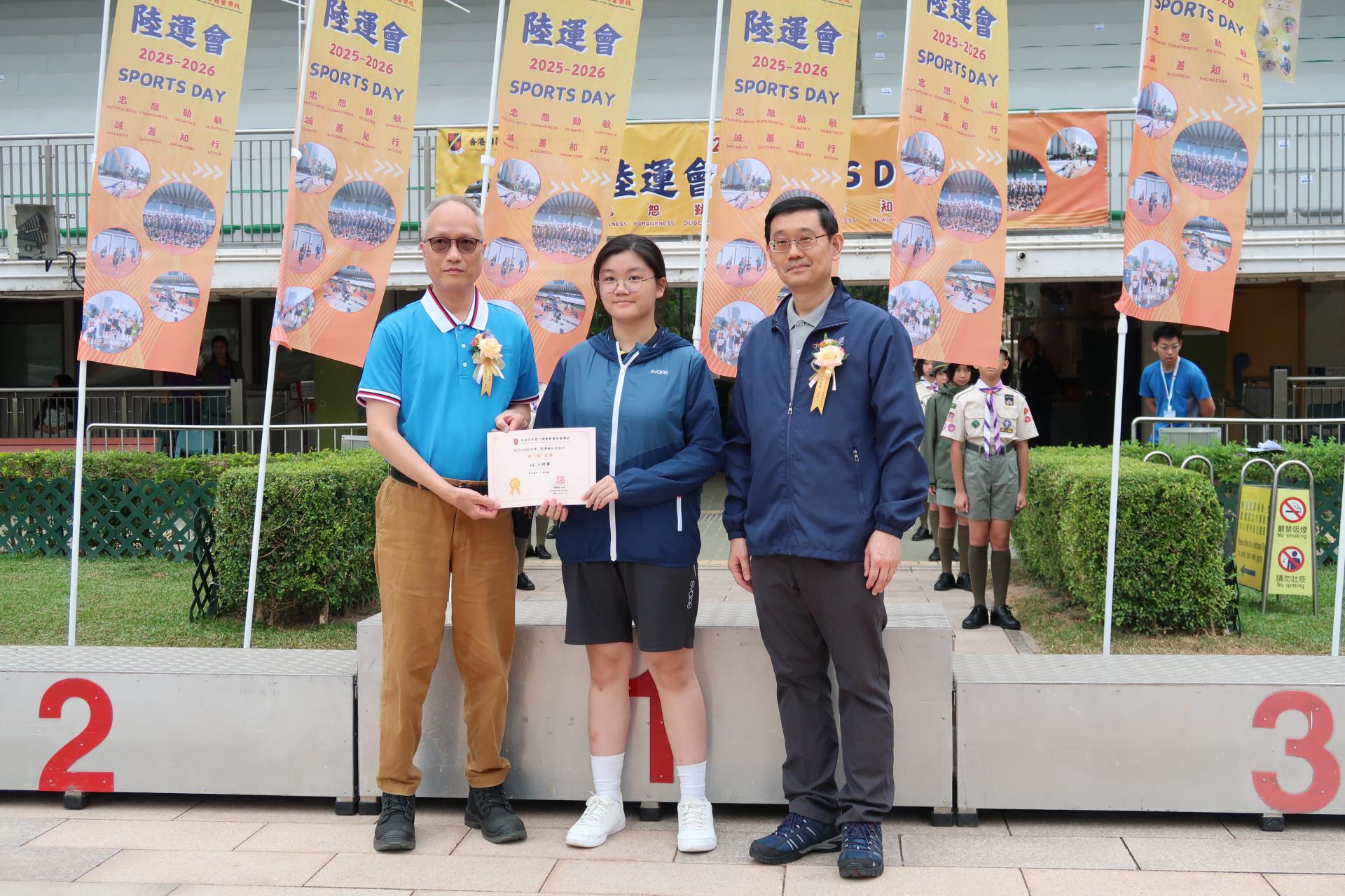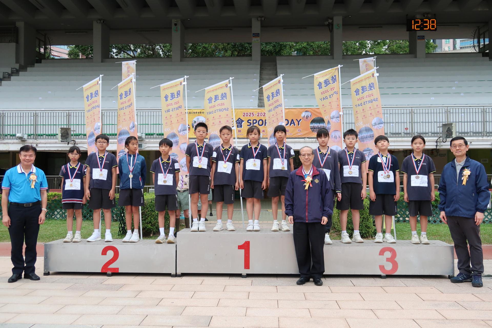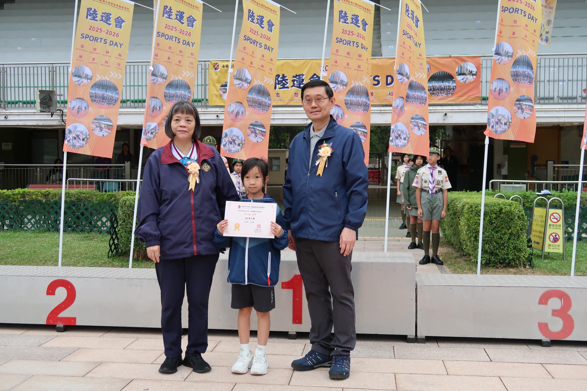 二零二五年十一月十一日本會屬校香港四邑商工總會新會商會學校假深水埗運動場舉行2025至2026年度陸運會頒獎典禮,恭請2023年杭州亞運代表/女子4×100米接力紀錄保持者/